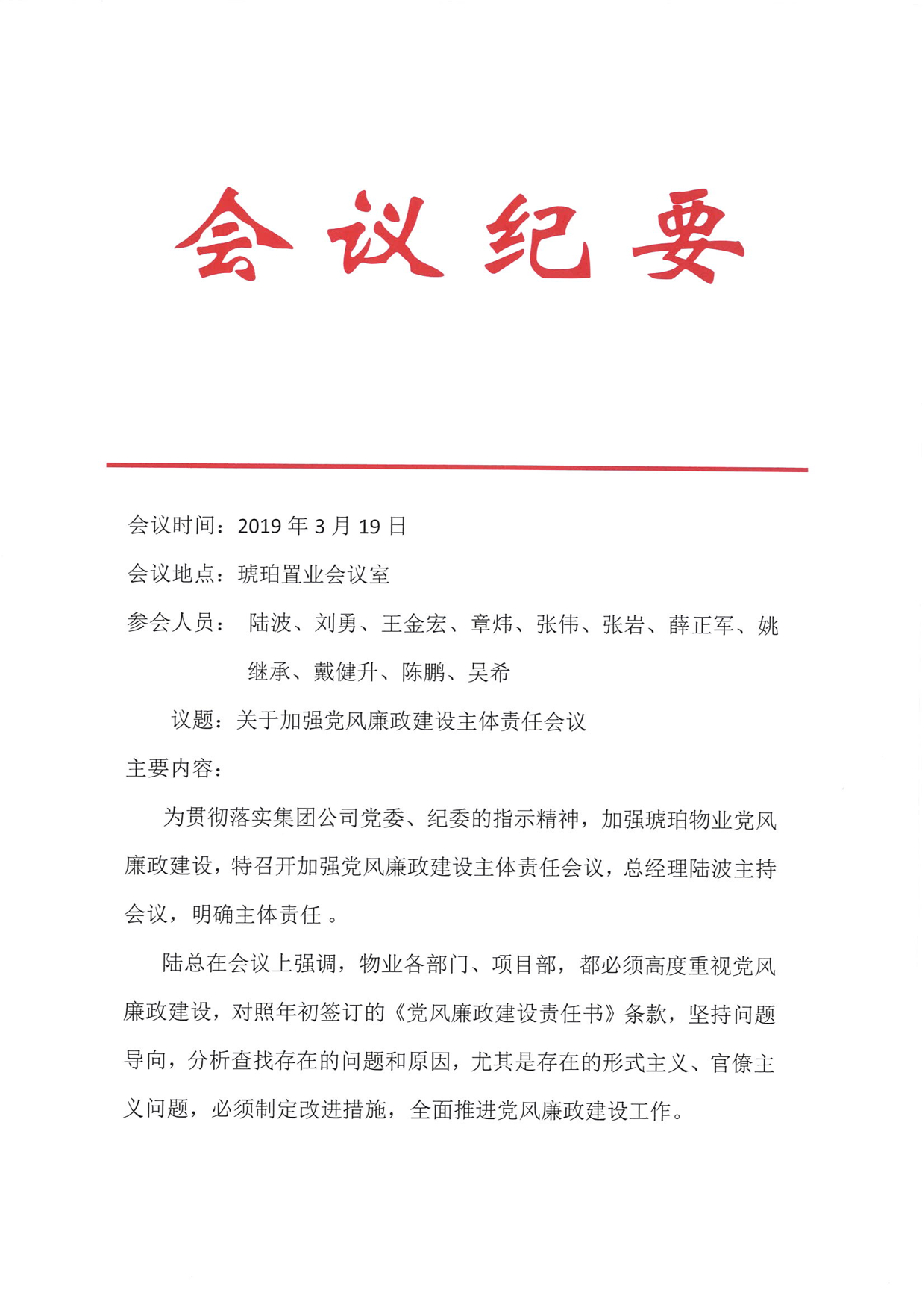 琥珀物业于2019年初,针对公司党风廉政建设主体责任落实召开专题会议,按照集团公司下发的党风廉政责任书的部署和要求组织、分解党风廉政建设任务,贯彻落实“三重一大”事项集体决策制度。